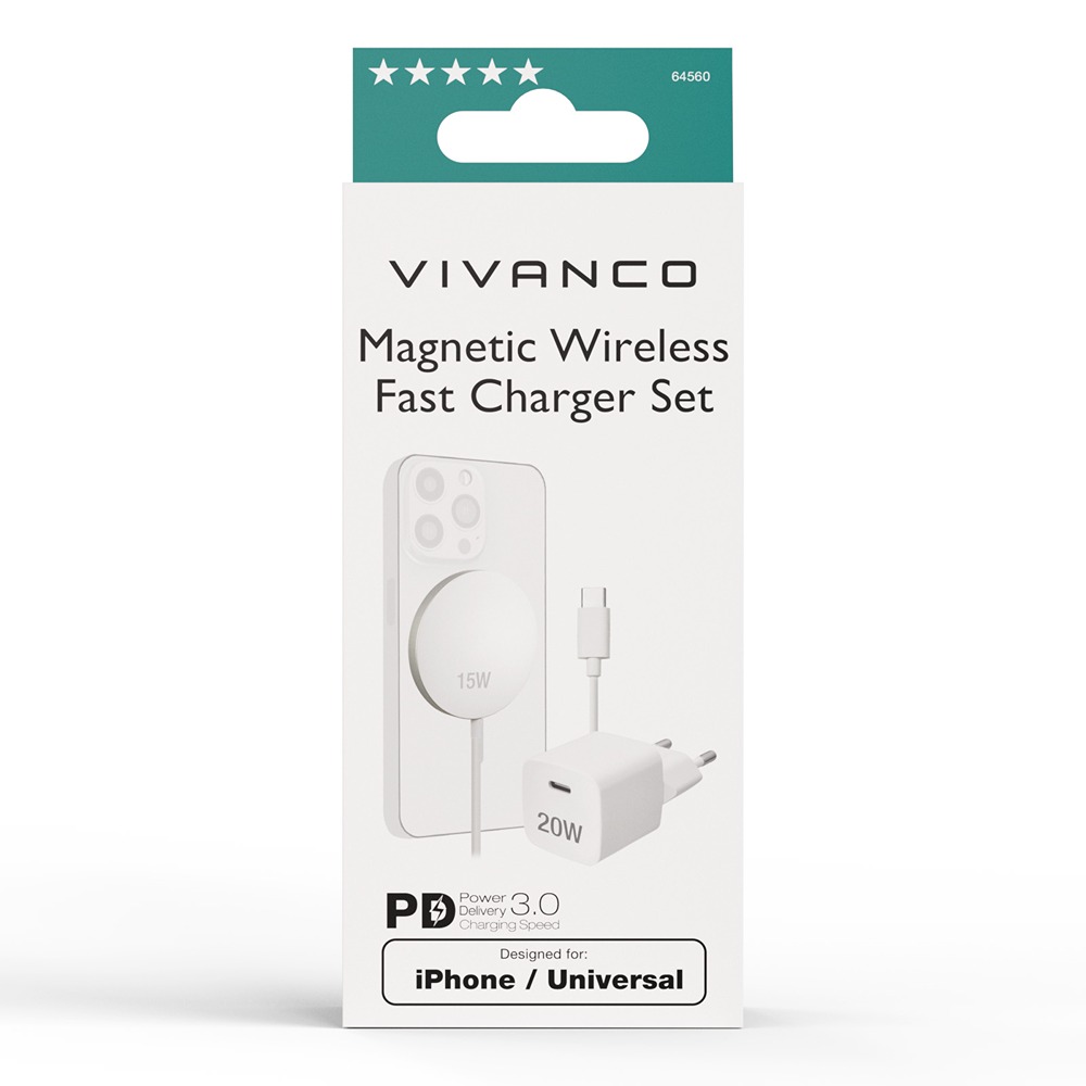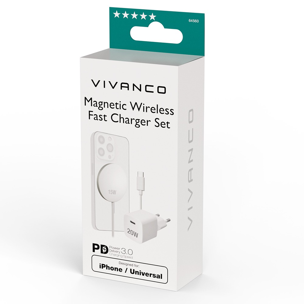 Tässä paketissa laturi on yhdistetty magneettiseen 15W langattomaan nopealaturiin, joka mahdollistaa kätevän, supersNOPEAn lataamisen yhteensopiville iPhoneille ja muille älypuhelinmalleille. Se on MagSafe-yhteensopiva ja napsahtaa automaattisesti paikoilleen täydellisesti linjattuna, mikä tarjoaa helpon ja nopean lataamisen. Langaton magneettiteline toimii kaikkien MagSafe-koteloiden sekä Vivanco MagHype-, MagClassic- ja MagSteady-suojakoteloiden kanssa.