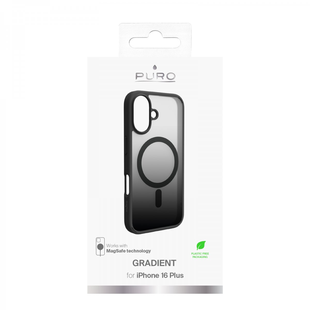 Puro iPhone 16 Plus kuori Gradient musta on musta ja läpinäkyvä suojakuori iPhone 16 Plussalle.