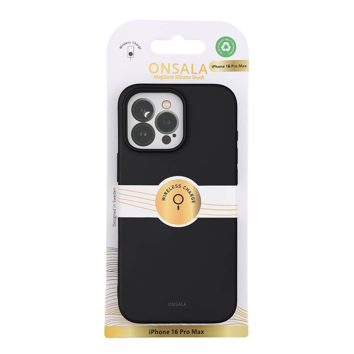 Onsala iPhone 16 Pro Max -kuori, silikonintuntuinen ja musta, on suojakuori iPhone 16 Pro Maxille.