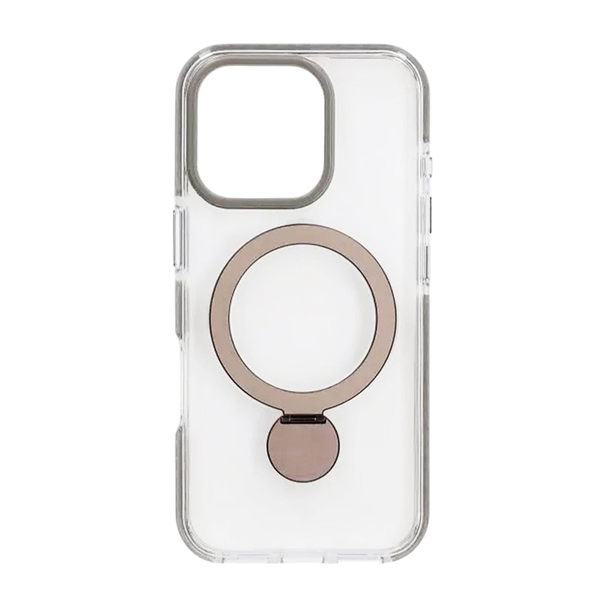 Anna iPhone 16 Pro Maxille sekä tyyliä että älykästä toimivuutta tämän läpinäkyvän ja harmaan MagSafe-kuoren avulla, joka on varustettu taitettavalla renkaalla, joka muuttuu nopeasti käytännölliseksi jalustaksi jokapäiväisessä elämässä.