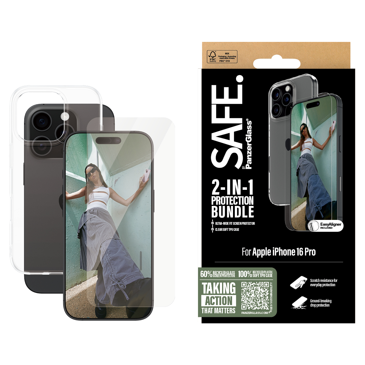 SAFE. by PanzerGlass iPhone 16 Pro Näytönsuoja ja Kuori 2-in-1 Protection Bundle on läpinäkyvä näytönsuoja iPhone 16 Pro:lle.