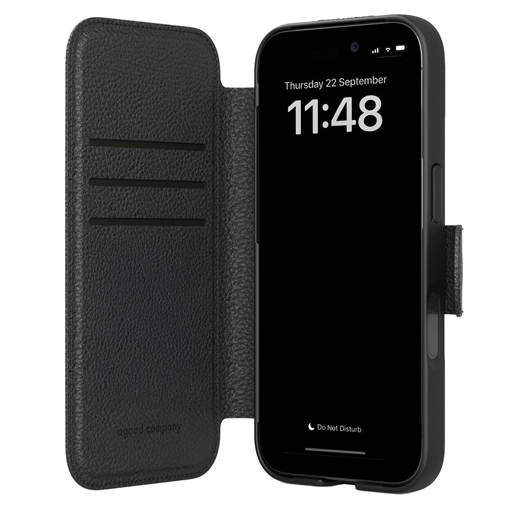agood company iPhone 17 Pro Max -kiertotaloudellinen lompakkokotelo, musta, on musta suojakuori iPhone 17 Pro Maxille.