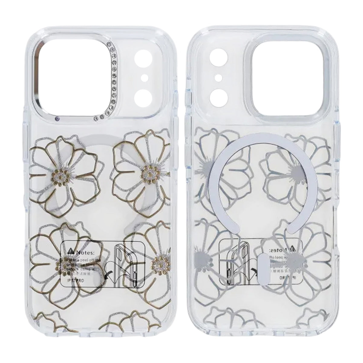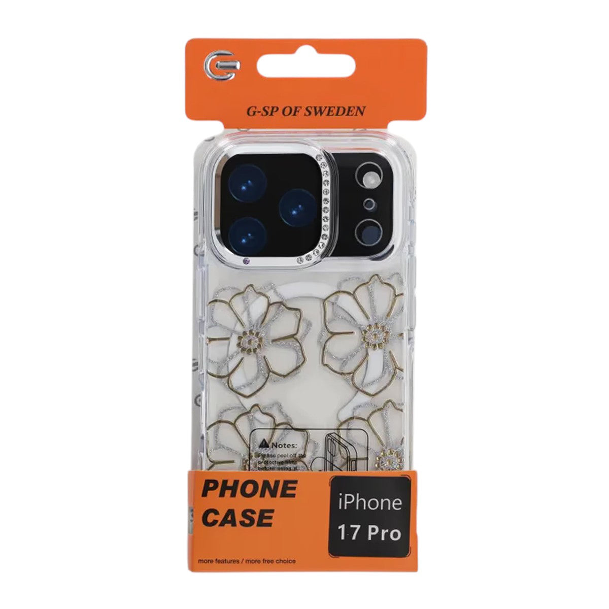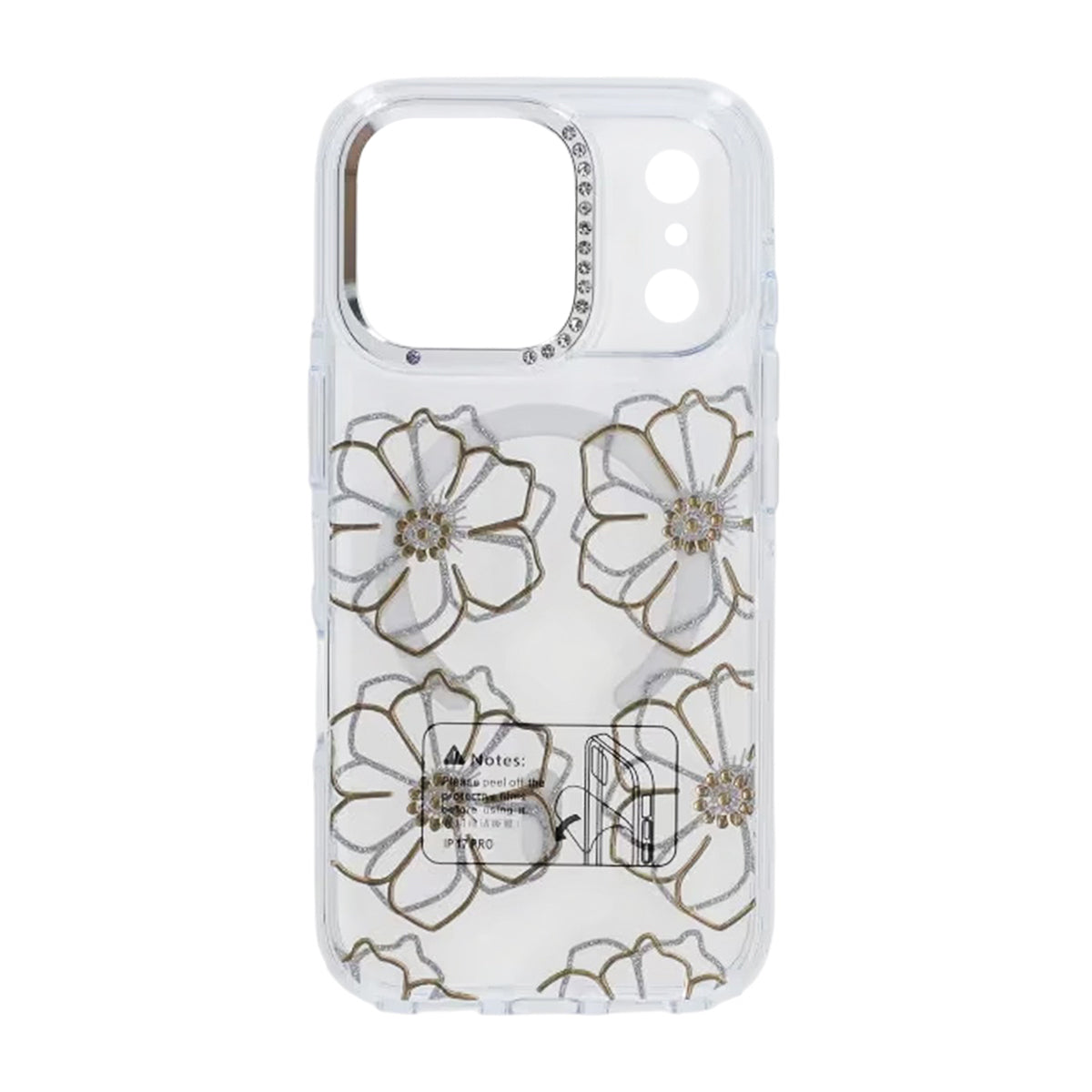 Anna iPhone 17 Pro:lle henkilökohtainen kosketus tällä läpinäkyvällä puhelimen kuorella, jossa on kultaisia kukkia.