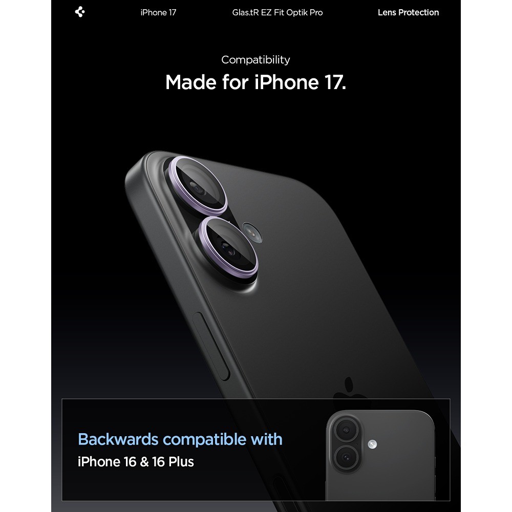 Spigen iPhone 17 Kameraskydd GLAS.tR EZ Fit Optik Pro 2-pack Lila on violetti ja läpinäkyvä kameran linssinsuoja Apple iPhone 17:lle.