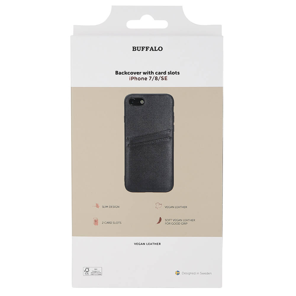 Buffalo iPhone 7/8/SE kuori Backcover with Card Slots musta on musta suojakuori iPhone 7:lle, iPhone 8:lle, iPhone SE 2020:lle ja iPhone SE 2022:lle.