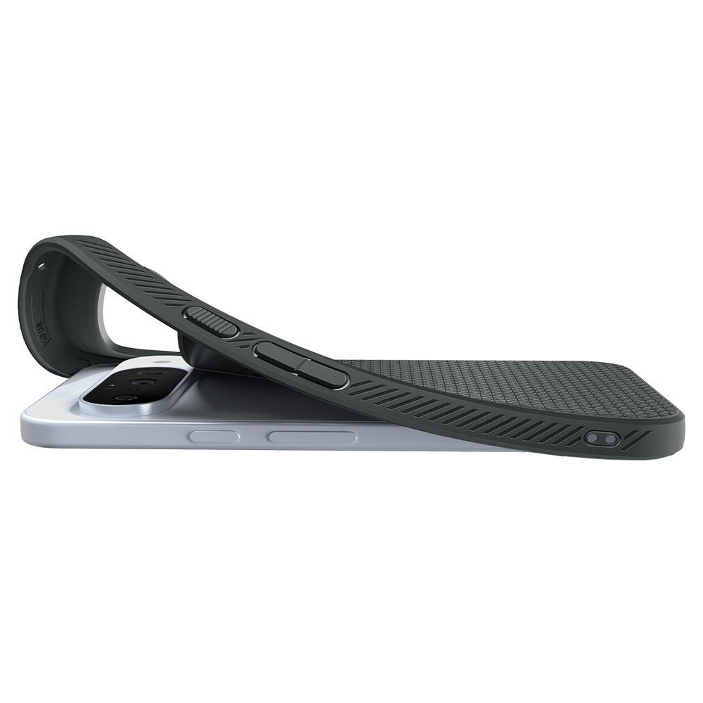Suoja on muotoiltu tiiviiseen istuvuuteen ja kapeaan profiiliin, joka sopii taskuun. Pinta on mattapintainen, ja siinä on geometrinen kuvio, joka parantaa pitoa ja auttaa vähentämään näkyviä sormenjälkiä.