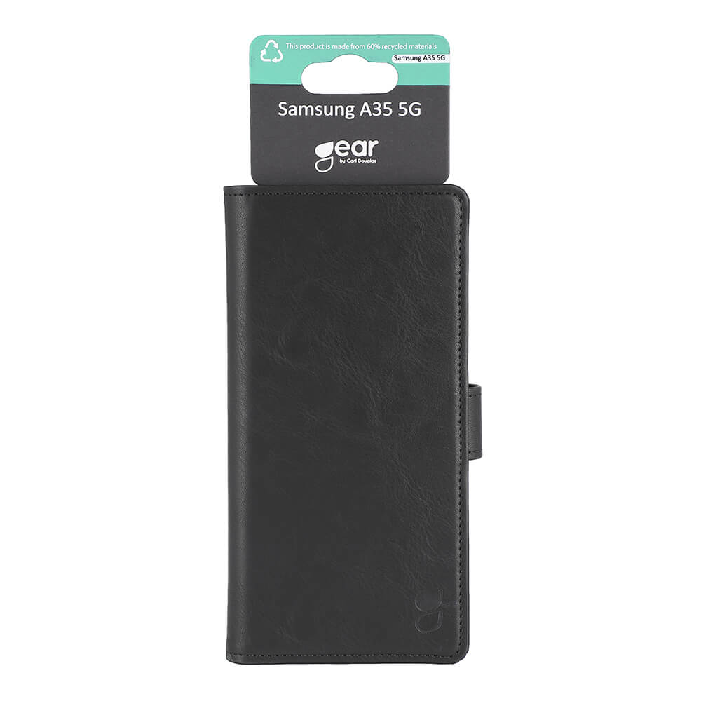 Gear Samsung Galaxy A35 -suojakotelo, jossa on 3 korttipaikkaa, on musta suojakotelo Samsung Galaxy A35:lle.