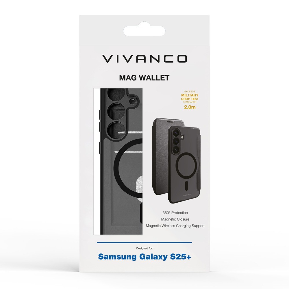 Vivanco Samsung Galaxy S25 Plus Kotelo Mag Wallet Musta on musta ja läpikuultava puhelinkotelo Samsung Galaxy S25 Plus -puhelimeen.