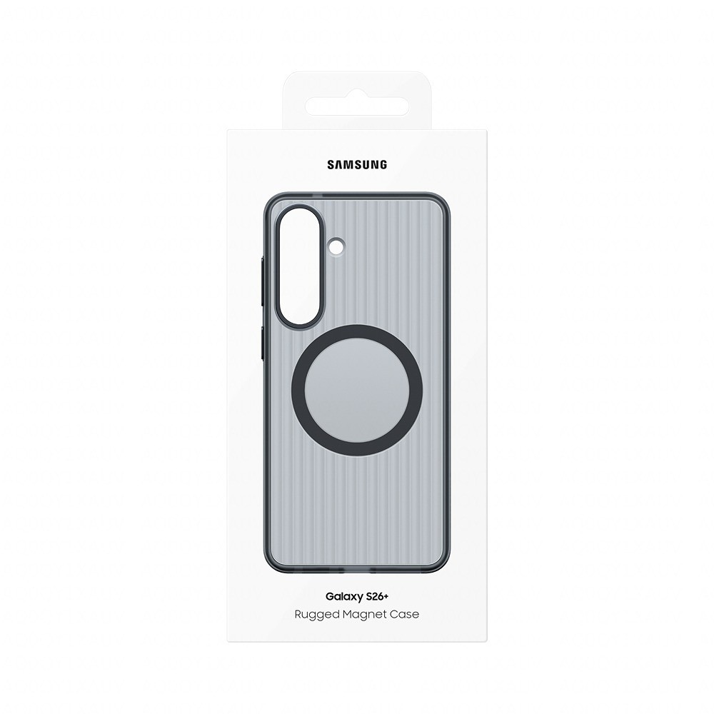 Samsung Original Galaxy S26 Plus Rugged Magnet Case (musta) on musta ja läpinäkyvä suojakuori Samsung Galaxy S26 Plusille.