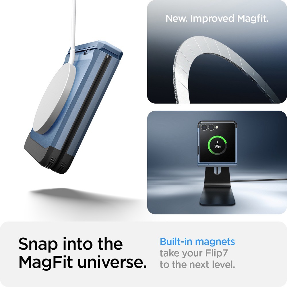Spigen Samsung Galaxy Z Flip 7 -kuori Tough Armor Pro MagFit Sierra Blue on sininen suojakuori Samsung Galaxy Z Flip 7:lle.