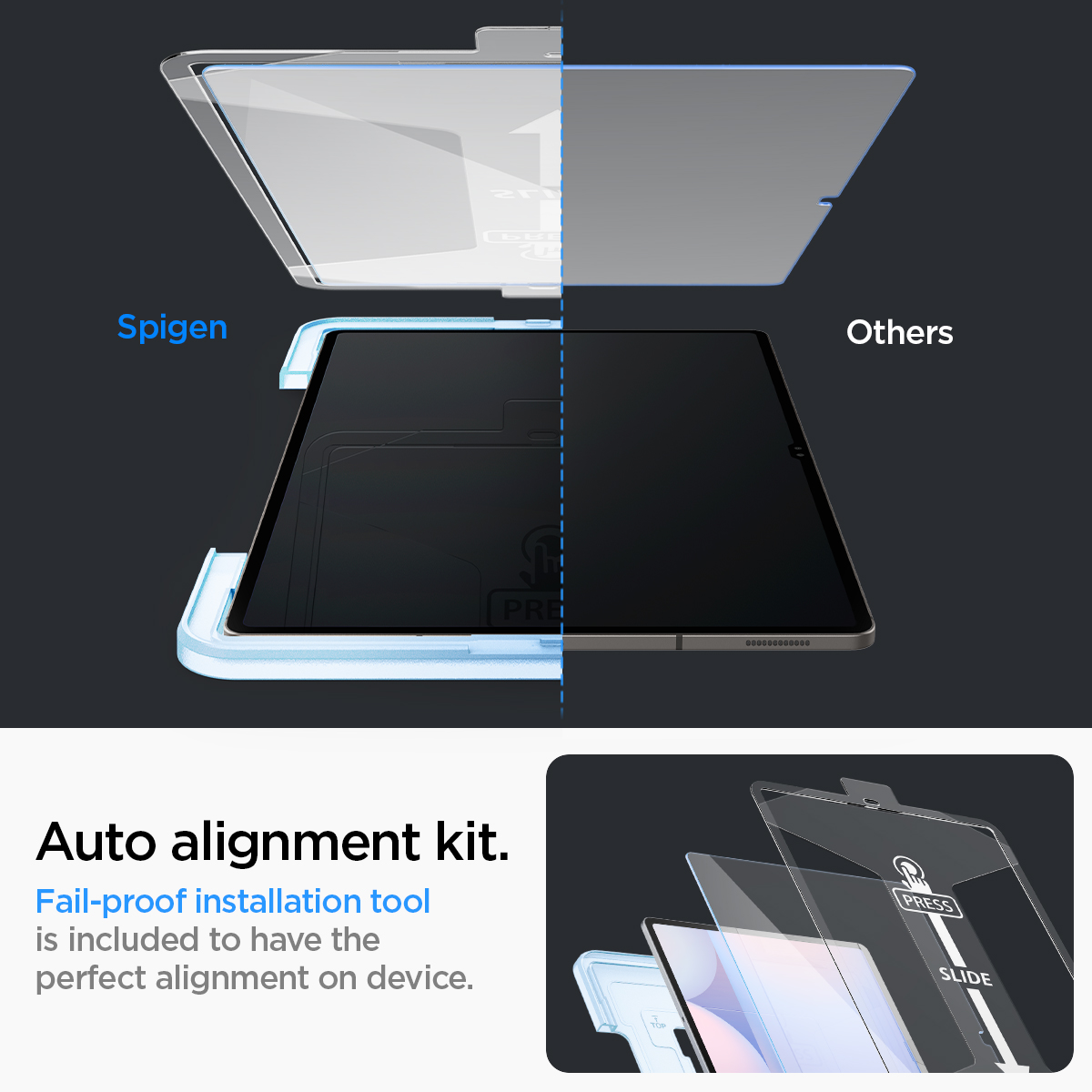 Asennus helpottuu asennuskehyksen avulla: aseta kehys tabletin päälle, paina keskeltä ja anna lasin kiinnittyä näyttöön.