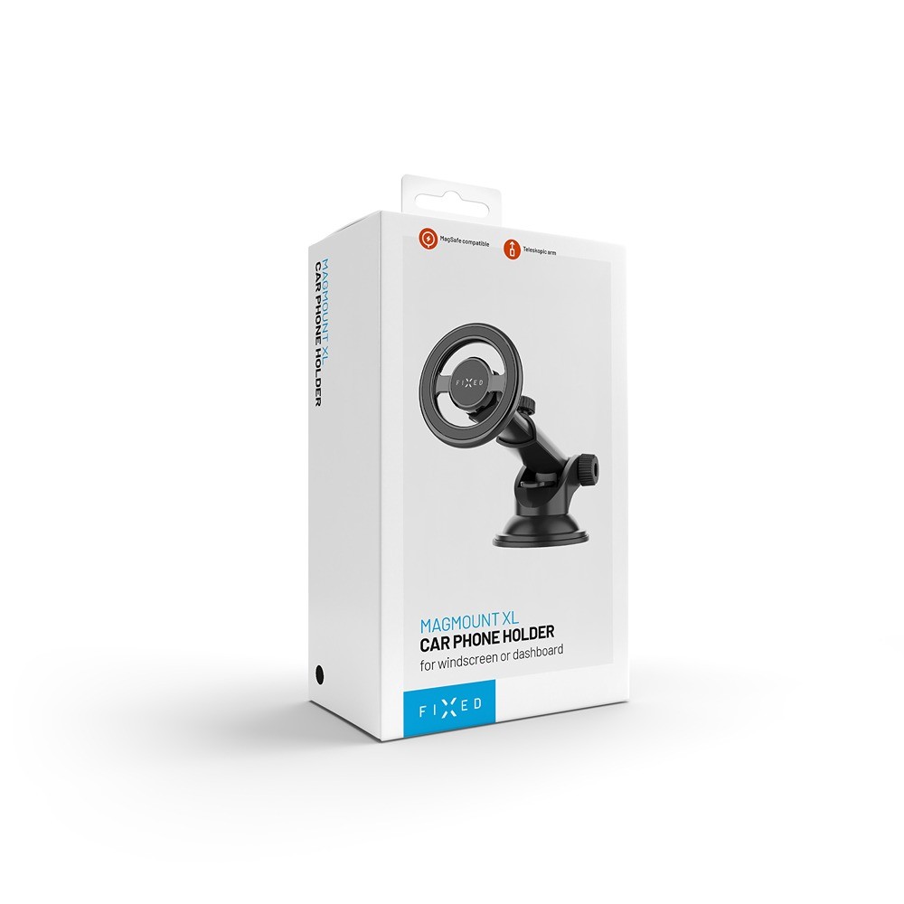 Magnettinen autonpidike FIXED MagMount XL, jossa on pidennetty varsi, sopii erityisesti MPV-autoille, pakettiautoille ja kaikille kuorma-autoille, joissa tuulilasi ja kojelauta ovat suuremmassa etäisyydessä kuljettajasta.