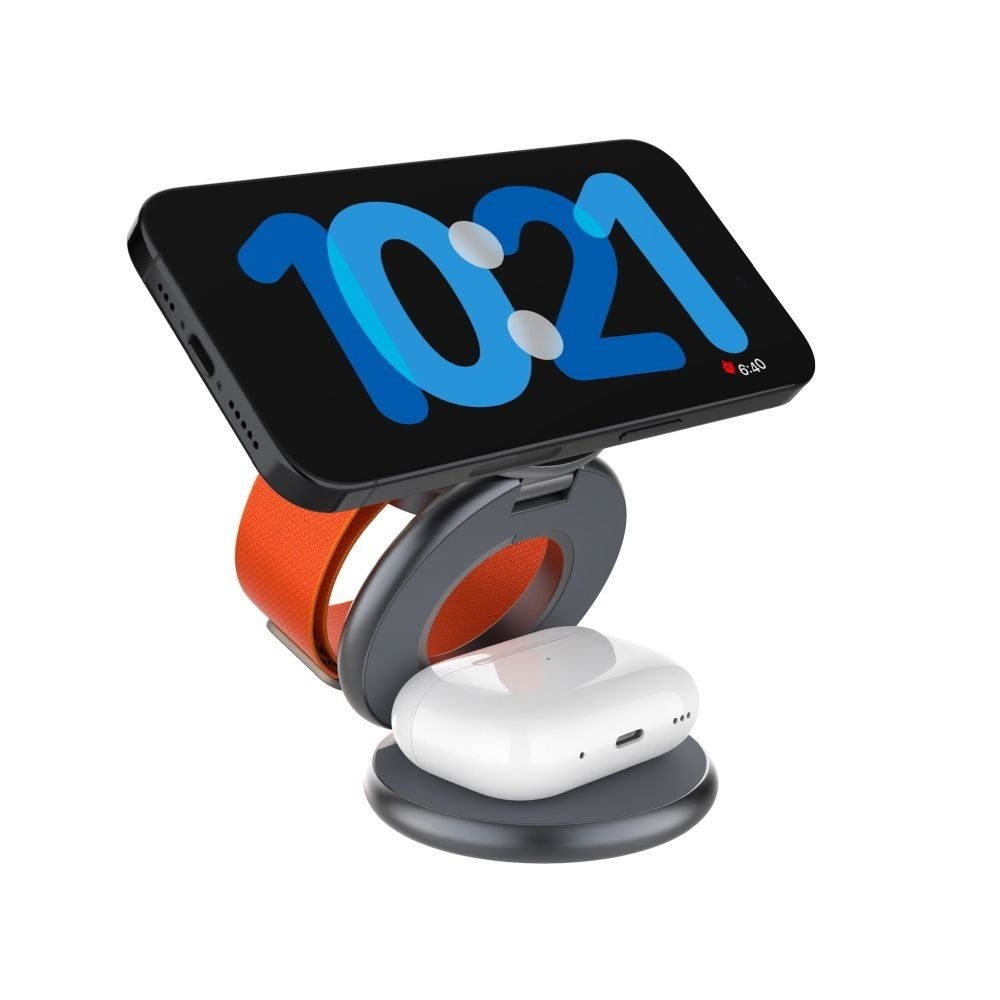 Erillinen alue huolehtii langattomista kuulokkeistasi, kun taas sisäänrakennettu flip-up-moduuli on omistettu Apple Watchille. Kuori on muotoiltu kestävästä metalliseoksesta, ja latauspintojen silikonielementit varmistavat, että laitteesi pysyvät naarmuttomina latauksen aikana. Säädettävien nivelten avulla asetat helposti haluamasi jalustakulman, joka pysyy tukevasti paikallaan. Kun taitat laturin kokoon, saat matkaystävällisen koon (73 x 73 x 26 mm) — ja yläpinta toimii edelleen latausalustana myös taitettuna.