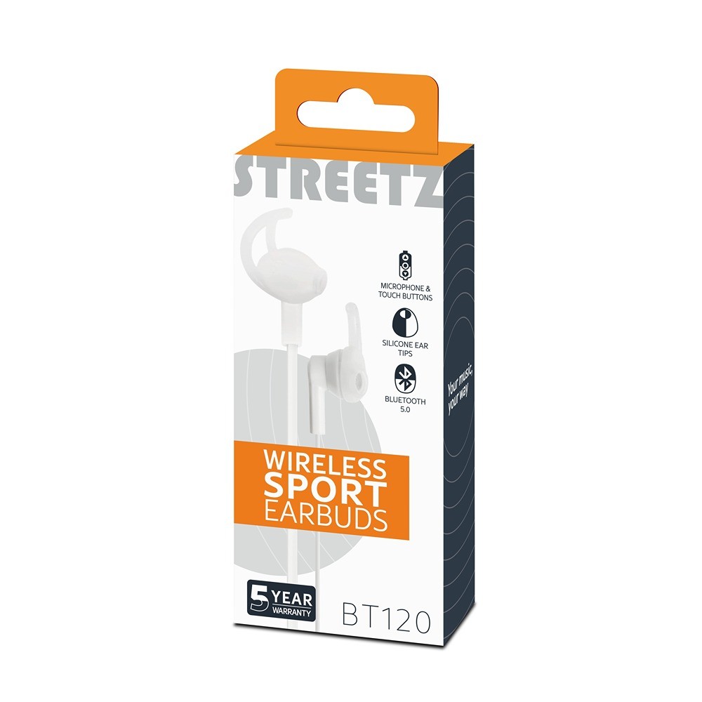 Langattomat Bluetooth 5 -kuulokkeet STREETZ:lta, joissa on korkea äänenlaatu, suunniteltu pysymään korvissasi harjoittelun ja muiden intensiivisten aktiviteettien aikana. Johto on 1.2 metriä pitkä ja varustettu mikrofonilla ja monitoiminapilla puheluiden ja median kätevää hallintaa varten.