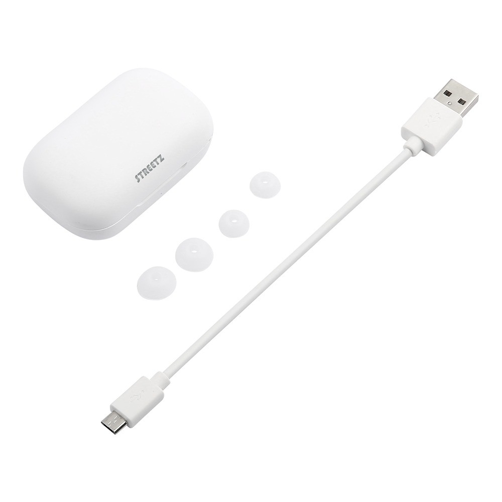 Langattomat TWS-kuulokkeet STREETZ:lta, joissa on mikrofoni, puhelu-/mediapainikkeet, Bluetooth 5 ja 10 m kantama sekä ergonominen istuvuus mukavaan kuunteluun jopa 16 tunnin ajan mukana toimitettavan latauskotelon avulla.