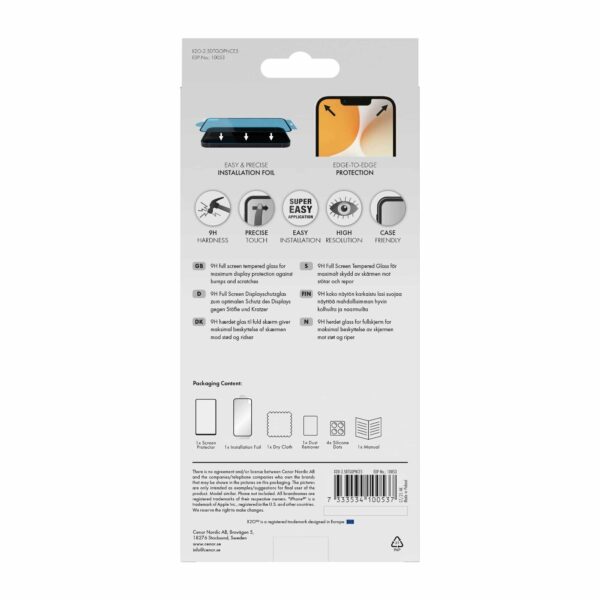 Asennus tapahtuu helpossa kolmivaiheisessa prosessissa ja mukana tulevan asennuskehyksen avulla, joka auttaa sijoittamaan näytönsuojan oikein.